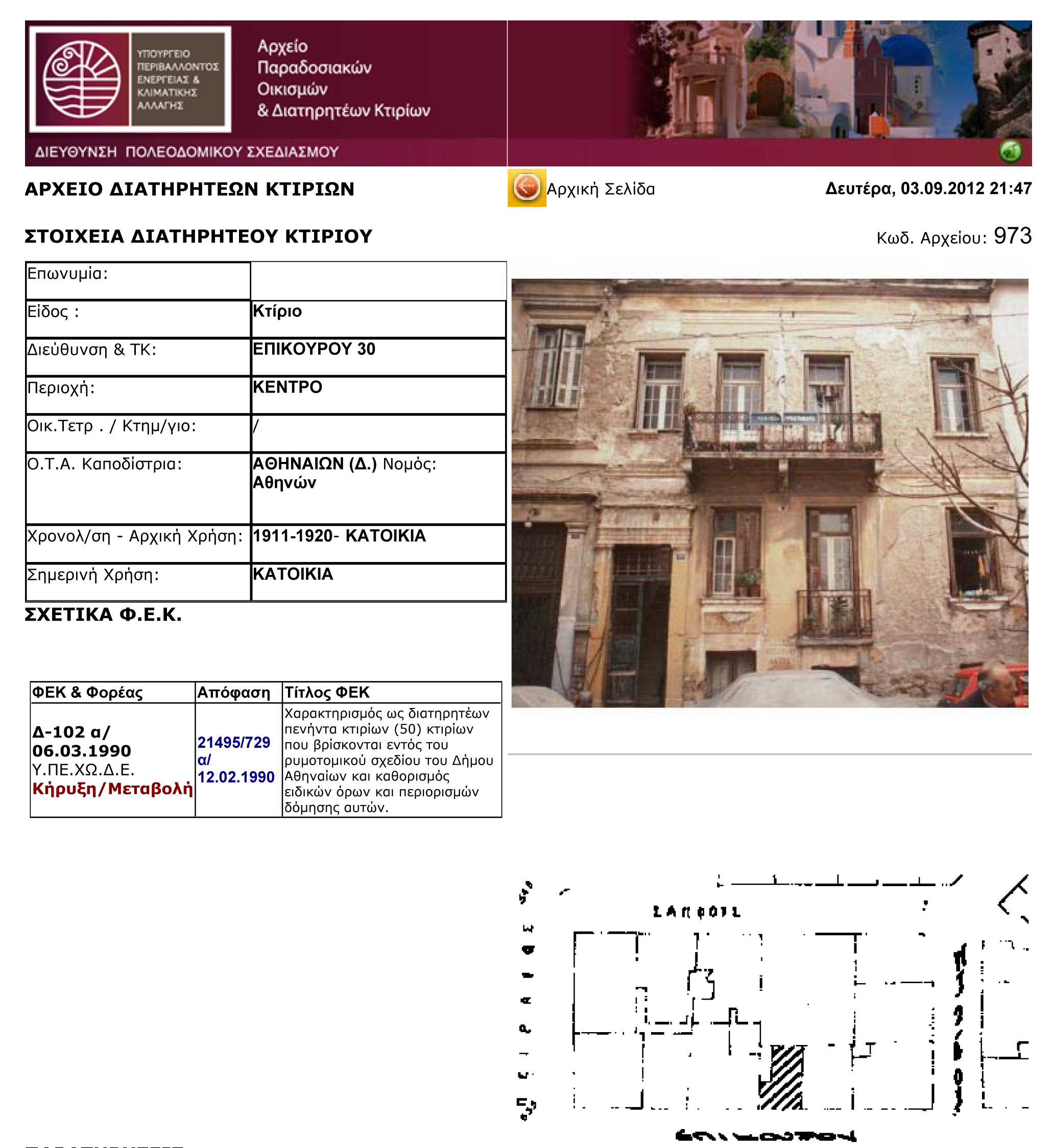 The decision was published on the Government Gazette 102D of March 6th, 1990 and included 50 buildings in the surrounding streets, among which those on Epikourou 26, 28 and 32.