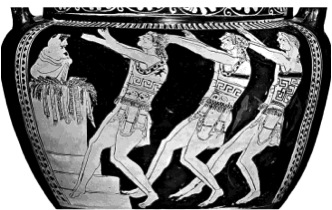 depicts cast members of a satyr play and tragic actors gathered around